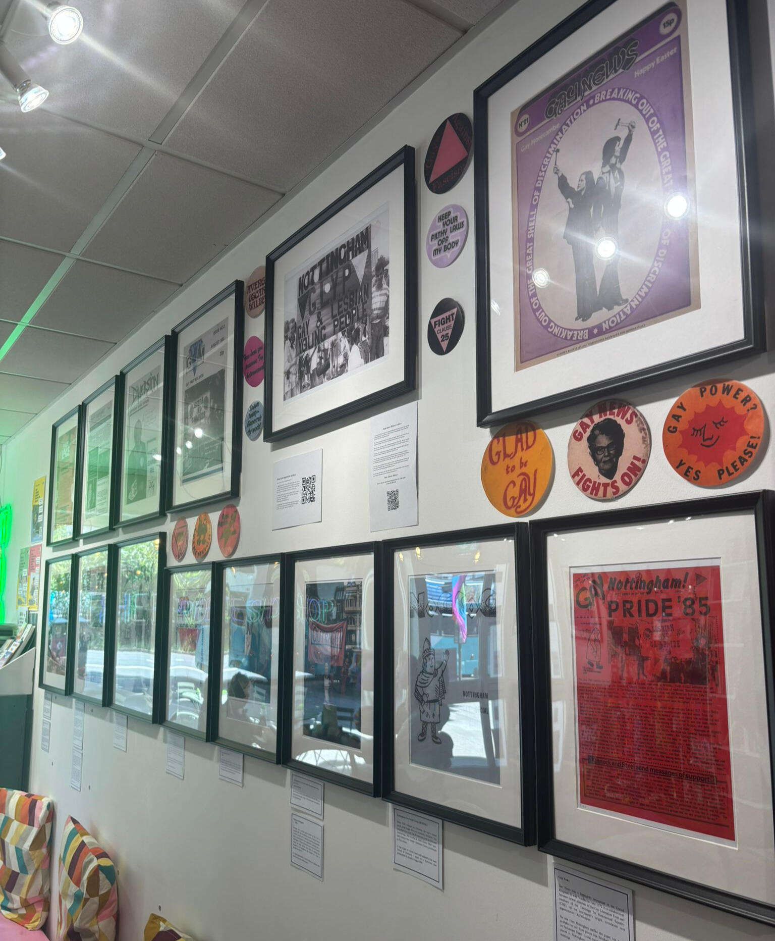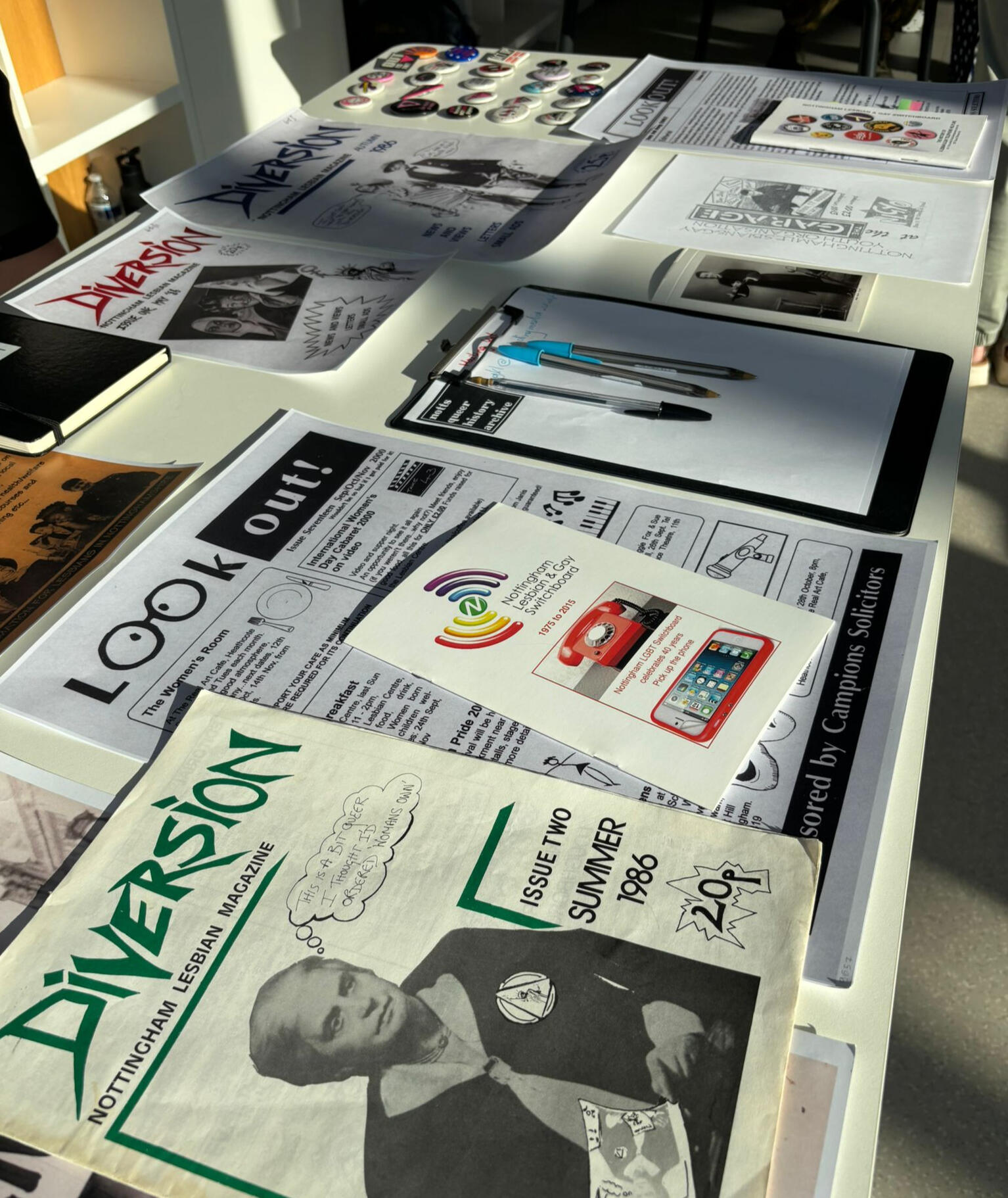 The archive is made up of three parts: oral history transcripts, donated items and media. It aims to collect queer histories, commemorate Nottinghams' contribution to queer rights and educate by holding events that share and bring our history to life.Anyone can donate an interview to the collection, both memebers of the LGBTQ+ community and allies. All that is asked is that you've experienced the Nottingham LGBTQ+ scene over the decades.Interviews can be conducted over the phone, Zoom or in person, depending on what works for you. It can also be completely anonymous if you'd prefer, and you don't have to give any personal details.We are also still accepting physical items, including (but not limited to) flyers, badges, leaflets, T shirts, zines, posters, nightclub or pub ephemera and more.Get in touch to discuss getting involved and let us know what you'd like to contribute.