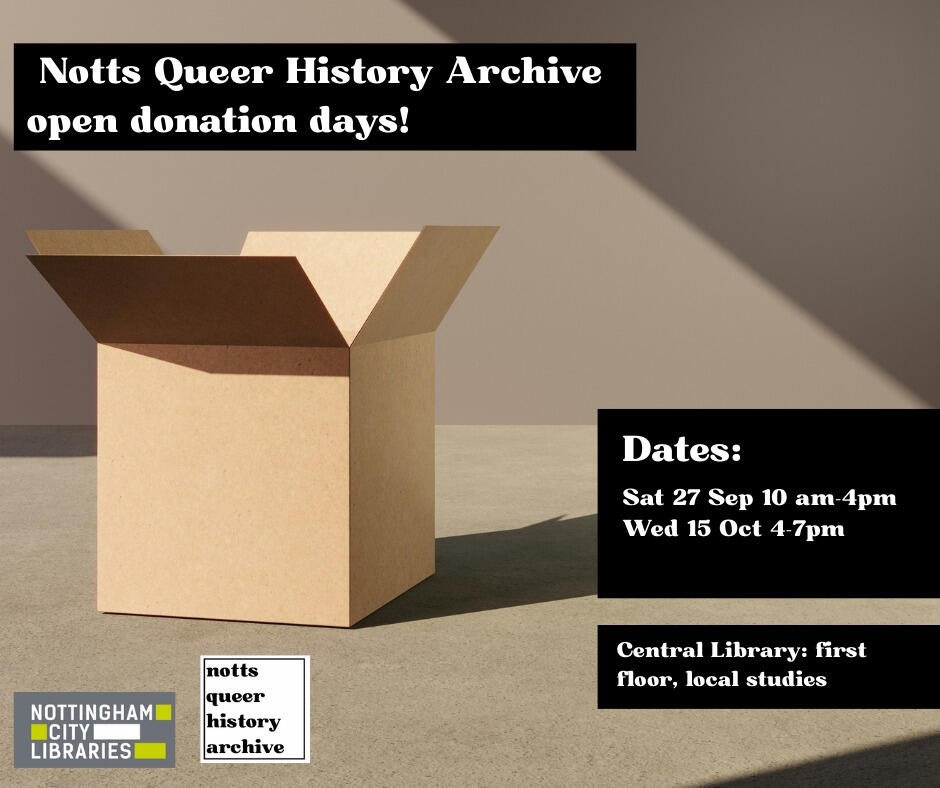 WHAT: Notts Queer History Archive Open Donation DaysWHEN: 10am - 4pm, Saturday 27th September5pm - 7pm, Wednesday 15th OctoberWHERE: FIrst Floor, Nottingham Central Library, 1 Carrington Street, Nottingham NG1 7FH